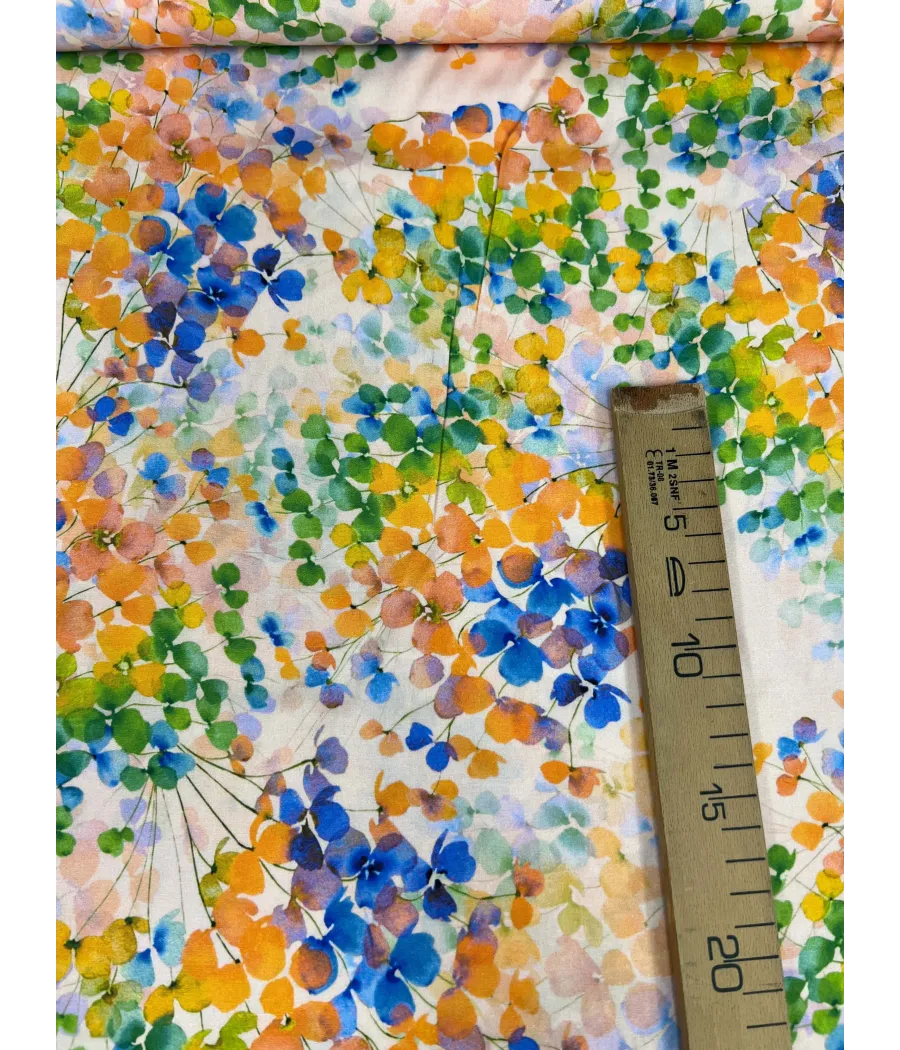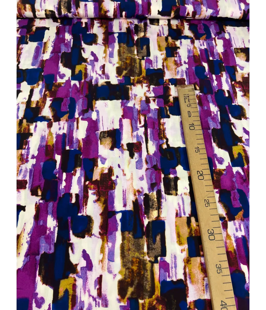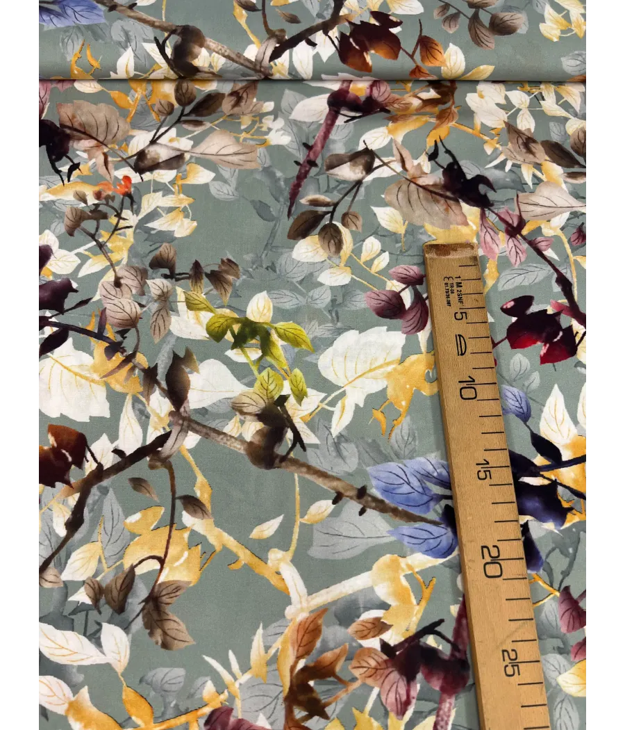 Plona , mažai glamži, šalavijo spalvos su įvairiaspalvėmis šakelėmis viskozė puikiai tinkanti lenvgiems vasaros rūbams. Gramatūra: 110 gr/m2