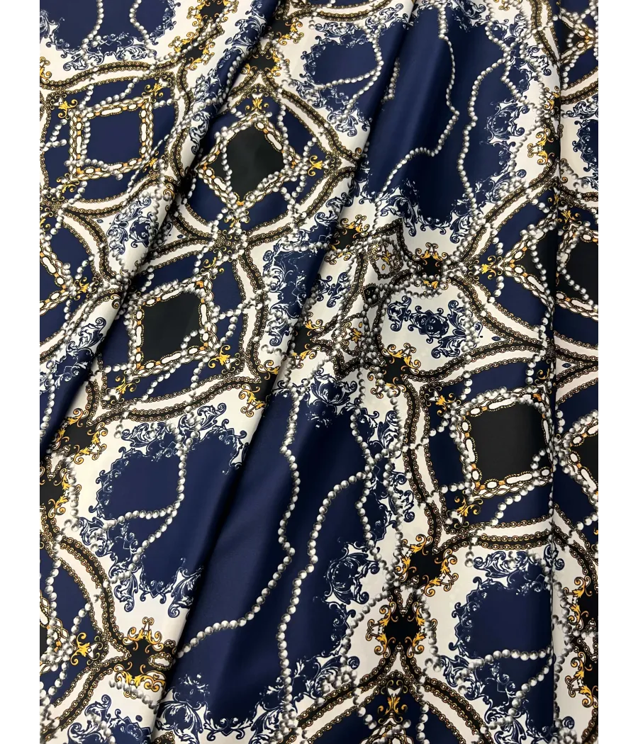 Prabangaus rašto, tamsiai mėlynas, satino audinys tinka puošniom suknelėm, sijonam, marškiniam, kelnėm.